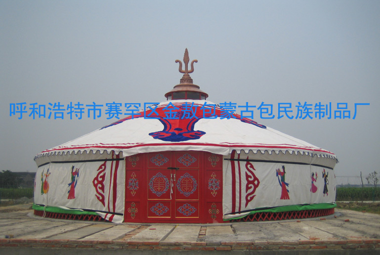 白色是蒙古人最喜爱的颜色之一。在日常生活中,他们接触最多的东西,比如毛毡、奶制品、皮张等都是白的。所以人们形成这样一种观念,即白色的东西越多,生活就越富足。久而久之,这种纯净的色彩又被赋予了高贵、纯洁、忠诚、善良等含义。蒙古包的外观以白色为主,这是由质朴的建筑材料—毛毡的特性决定的。在蒙古高原强烈的阳光下,白色是最醒目的色彩。它不但能清晰地勾勒出建筑浑圆、饱满的外轮廓,让它从一片苍翠中“跳”出来,而且还能和变幻的白云、聚散的羊群形成很好的呼应效果。再加上毛毡表面绣着各种吉祥图案,给原本稍显呆板的纯色注人了无限生机可以说,正是这种既纯净又富张力,既质朴又不失华美的白色,将蒙古包的美发挥得淋漓尽致。